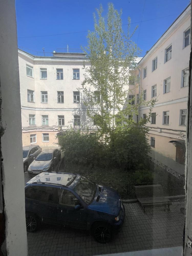 Окна выходят в большой зеленый двор с детской площадкой и парковкой.